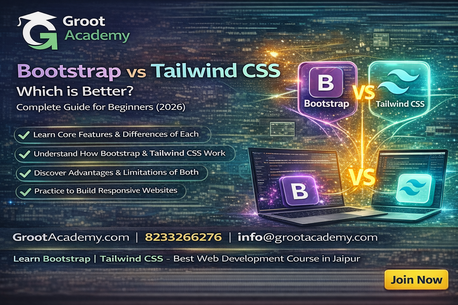 In this guide, you will learn the difference between Bootstrap and Tailwind CSS, advantages, disadvantages, career scope, and where to learn frontend development in Jaipur at Groot Academy.