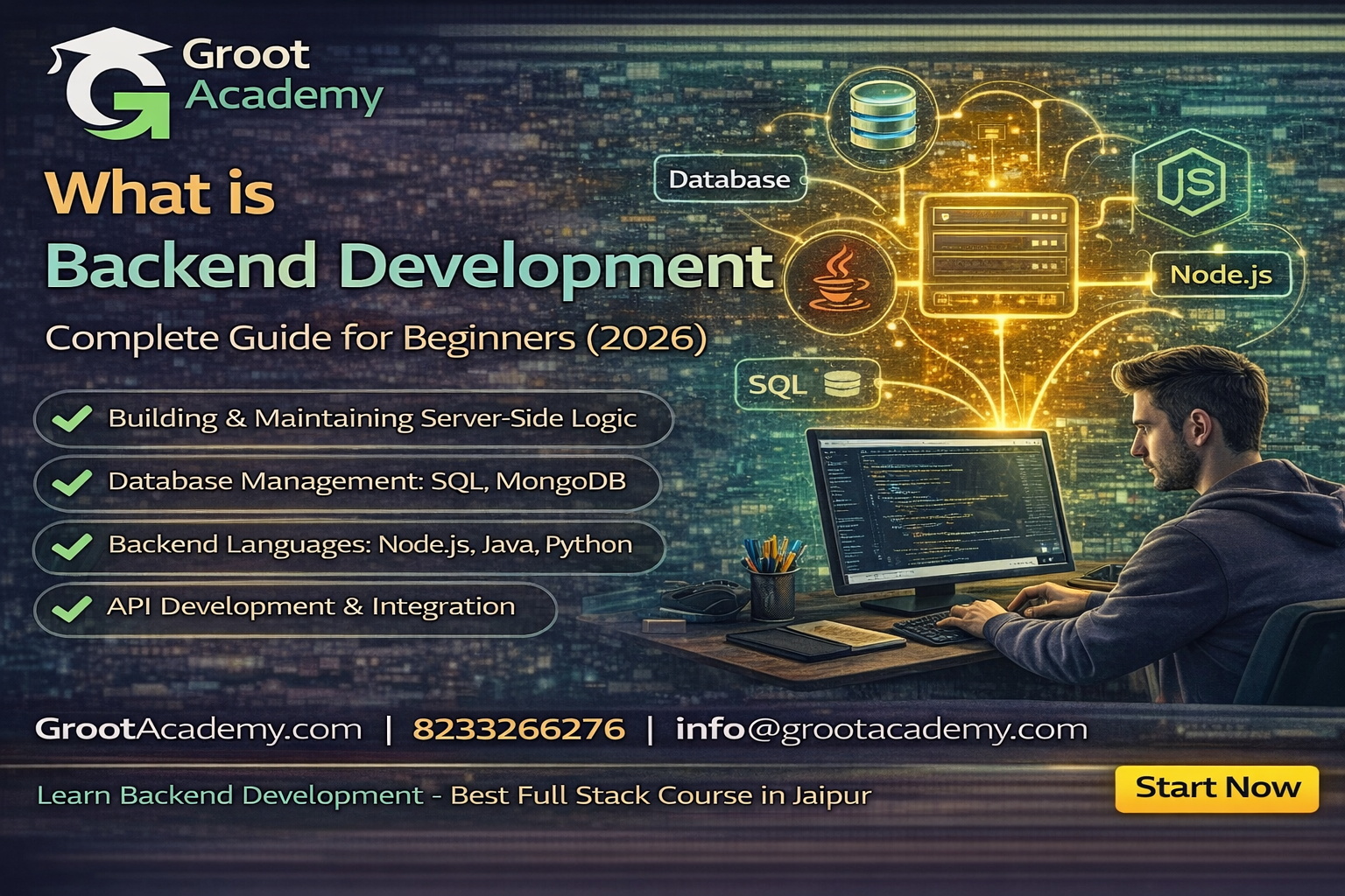 In this guide, you will learn what backend development is, skills required, languages used, career scope, and where to learn backend development in Jaipur at Groot Academy.
